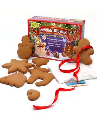 В набор входят готовые имбирно-медовые пряники ручной работы, сахарная пудра, кондитерская посыпка, шоколадное драже, атласные ленты и кондитерские мешки - все, что нужно для создания семи новогодних игрушек. Инструкция для росписи находится на коробке. Имбирно-медовые пряники для создания "Ёлочных Игрушек" и остальные составляющие набора упакованы в подарочную коробку.