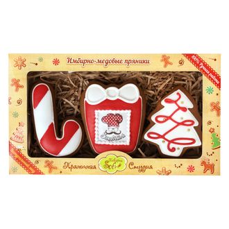 Состав: мука пшенич. в/с; сахар белый; мед натур.; маргарин 60%: масла растительные дезодорированные, вода, соль, эмульгатор (Е471), сливочное масло, консервант (сорбат калия), регулятор кислотности (кислота лимонная), краситель (Е100, Е160b), ароматизатор; кондитерская глазурь: сахарная пудра, вода, сухой яичный белок , смесь для окрашивания пищевых продуктов: сахар, влагоудерживающий агент (глицерин), красители пищевые (Е102, Е133, Е124, Е110, Е122, Е124, Е129), загустители (камедь гуаровая, камедь рожкового дерева, Е1414), антиокислитель (кислота лимонная), консерванты (Е202, Е211); яйцо куриное; разрыхлитель теста : регулятор кислотности – Е500, стабилизатор – Е450ii, кукурузный крахмал; какао-порошок; имбирь молотый; корица молотая; ванилин. Пищевая ценность на 100 г продукта: белки 4,8г., углеводы 77,7 г., жиры 2,8 г.Энергетическая ценность на 100 г продукта: 355 Ккал/1485 кДж.